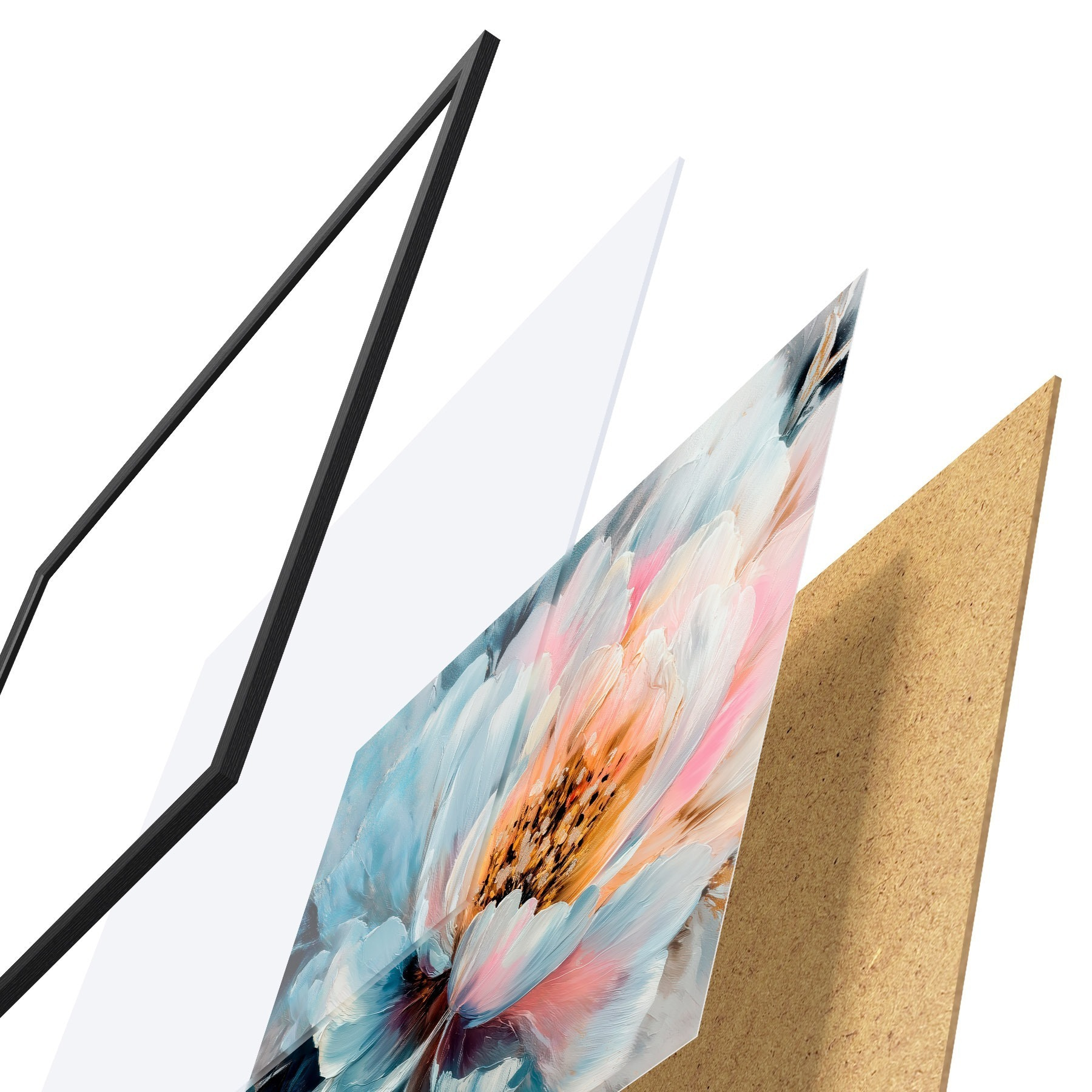 Plagát sa skladá z rámu, plexiskla, vytlačeného obrazu a podkladu z drevotriesky. Plagát možno okamžite zavesiť na stenu vďaka úchytom na zadnej strane.