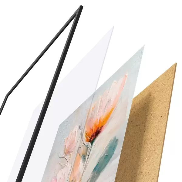 Plagát sa skladá z rámu, plexiskla, vytlačeného obrazu a podkladu z drevotriesky. Plagát možno okamžite zavesiť na stenu vďaka úchytom na zadnej strane.