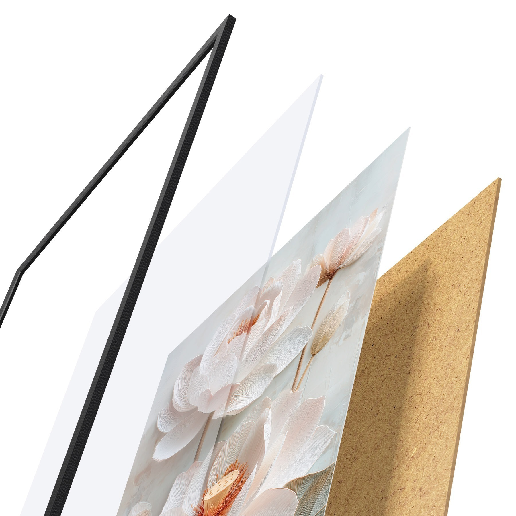 Plagát sa skladá z rámu, plexiskla, vytlačeného obrazu a podkladu z drevotriesky. Plagát možno okamžite zavesiť na stenu vďaka úchytom na zadnej strane.