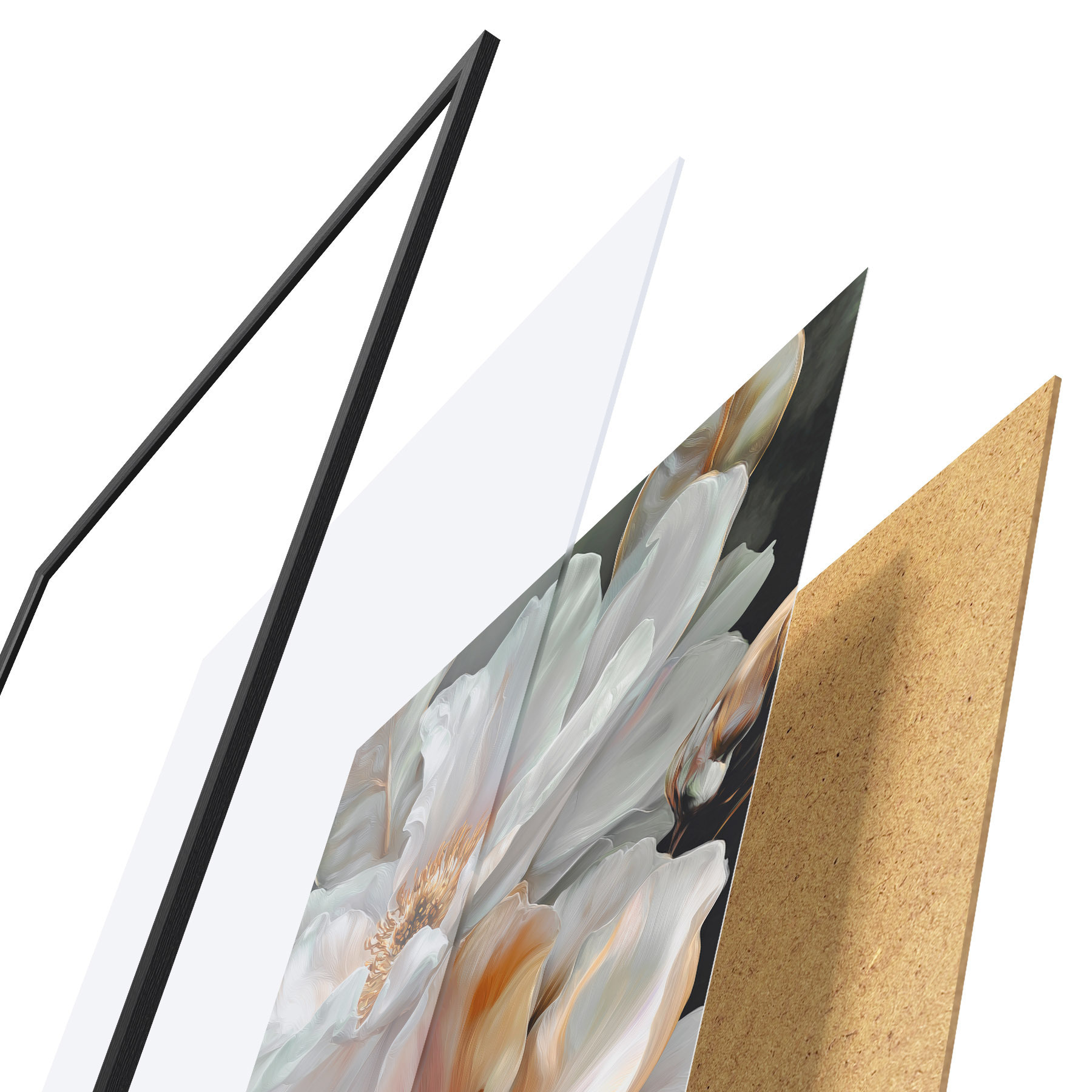Plagát sa skladá z rámu, plexiskla, vytlačeného obrazu a podkladu z drevotriesky. Plagát možno okamžite zavesiť na stenu vďaka úchytom na zadnej strane.