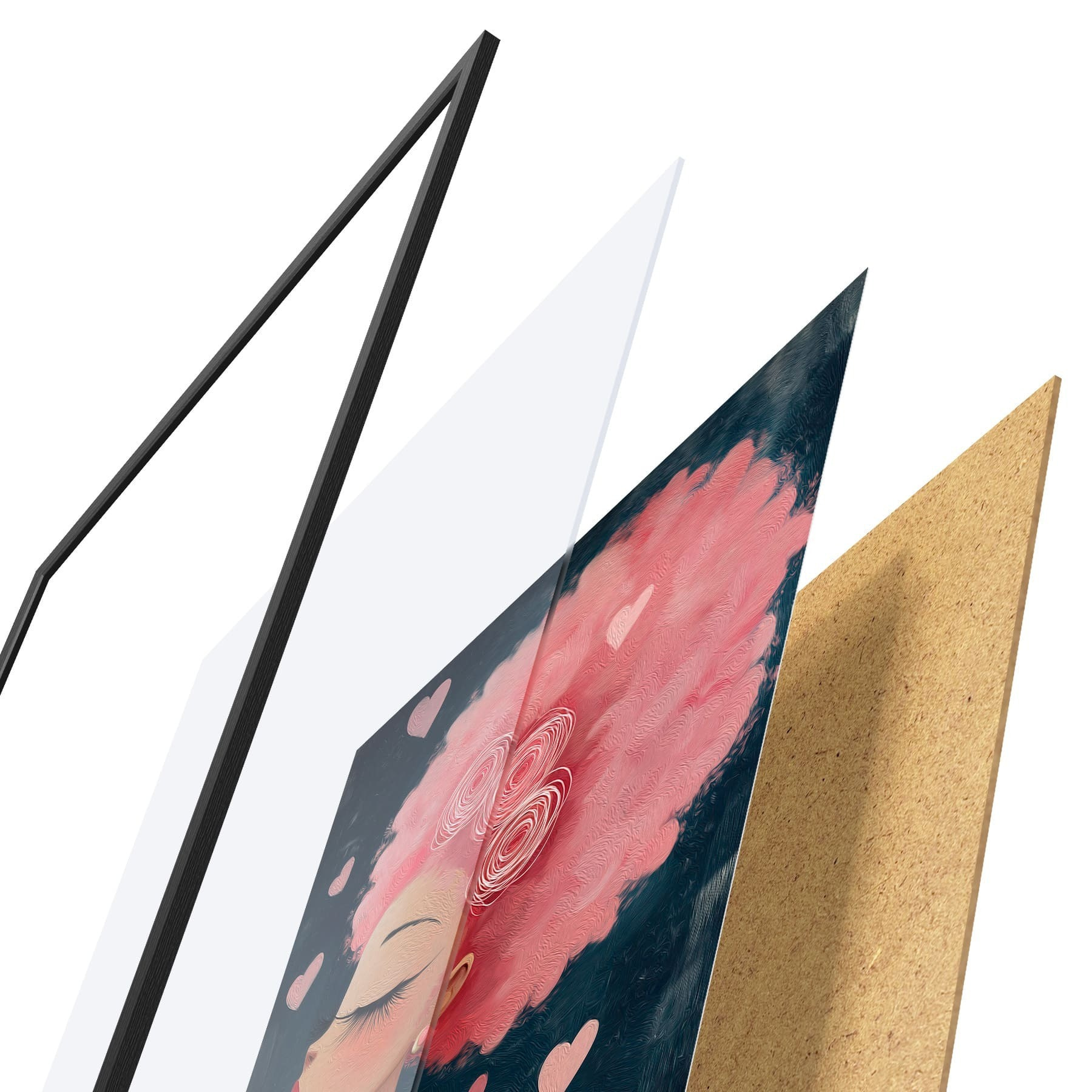 Plagát sa skladá z rámu, plexiskla, vytlačeného obrazu a podkladu z drevotriesky. Plagát možno okamžite zavesiť na stenu vďaka úchytom na zadnej strane.