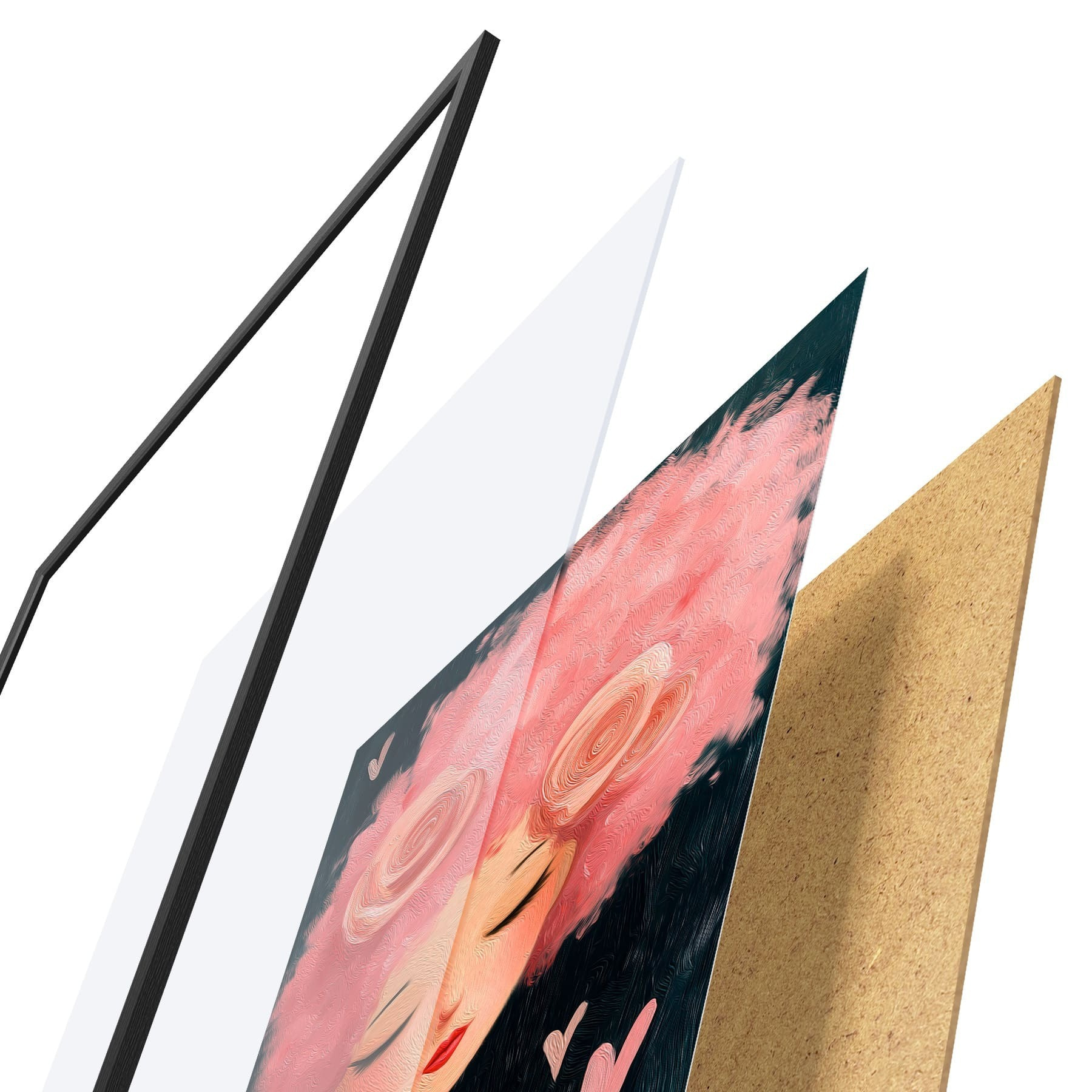 Plagát sa skladá z rámu, plexiskla, vytlačeného obrazu a podkladu z drevotriesky. Plagát možno okamžite zavesiť na stenu vďaka úchytom na zadnej strane.
