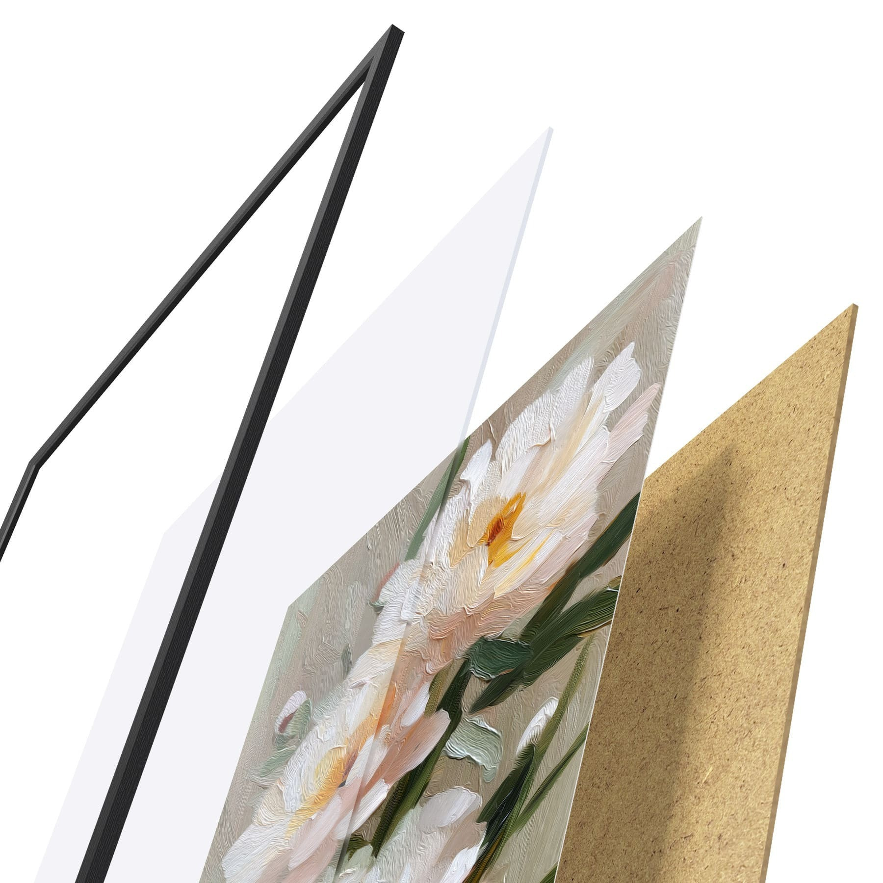 Plagát sa skladá z rámu, plexiskla, vytlačeného obrazu a podkladu z drevotriesky. Plagát možno okamžite zavesiť na stenu vďaka úchytom na zadnej strane.