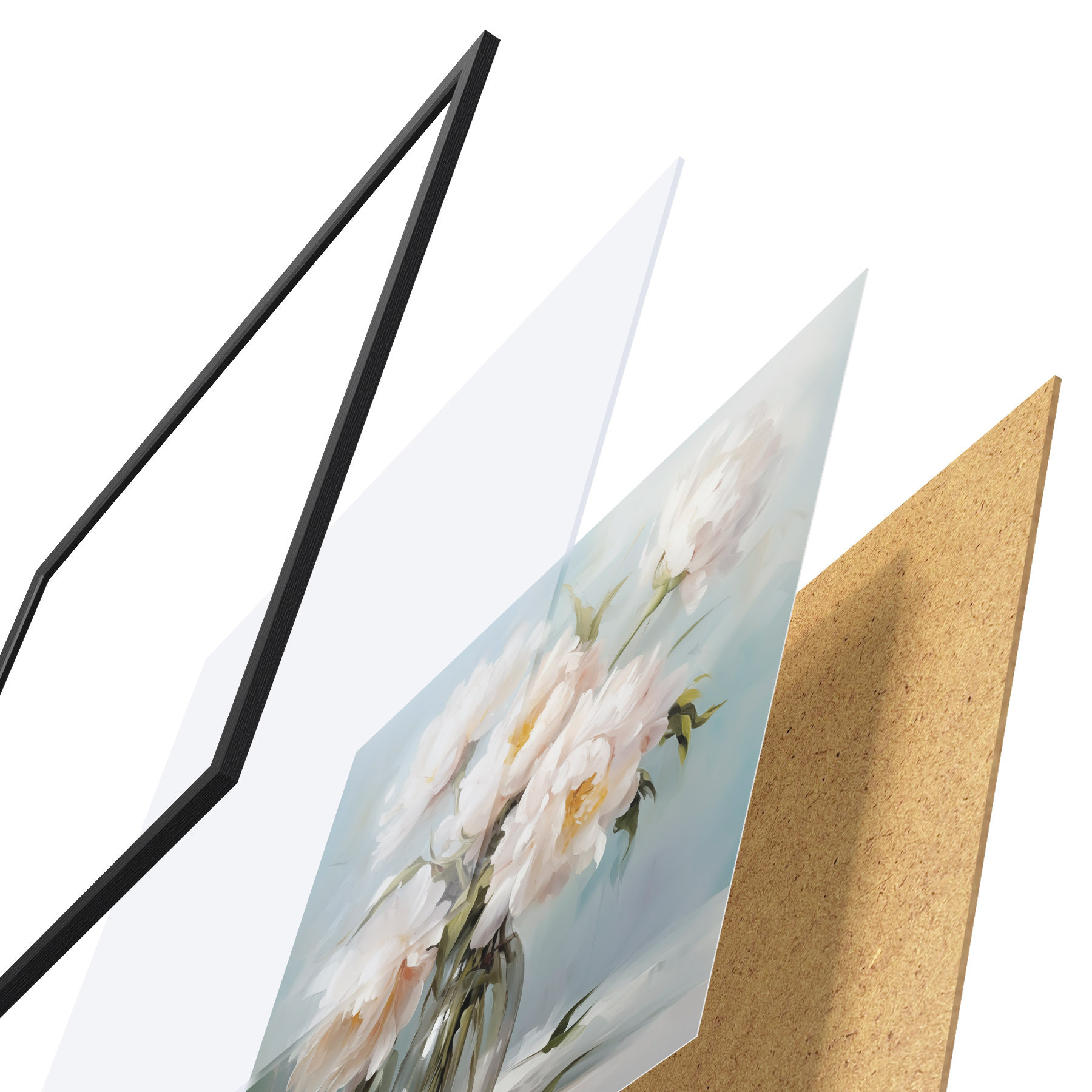 Plagát sa skladá z rámu, plexiskla, vytlačeného obrazu a podkladu z drevotriesky. Plagát možno okamžite zavesiť na stenu vďaka úchytom na zadnej strane.