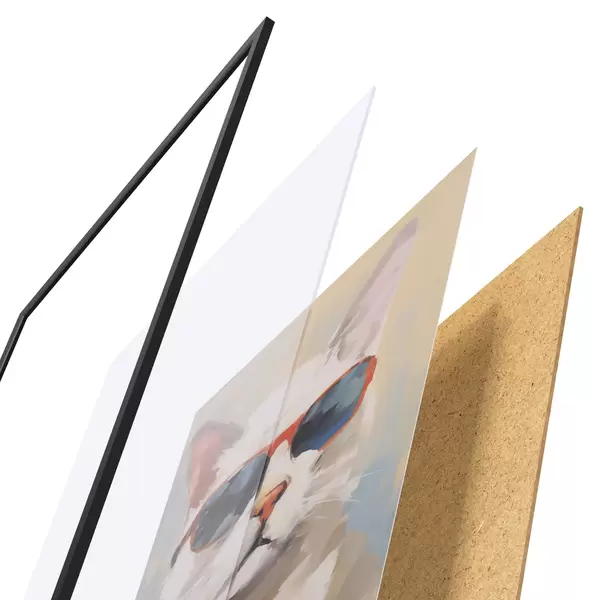 Plagát sa skladá z rámu, plexiskla, vytlačeného obrazu a podkladu z drevotriesky. Plagát možno okamžite zavesiť na stenu vďaka úchytom na zadnej strane.
