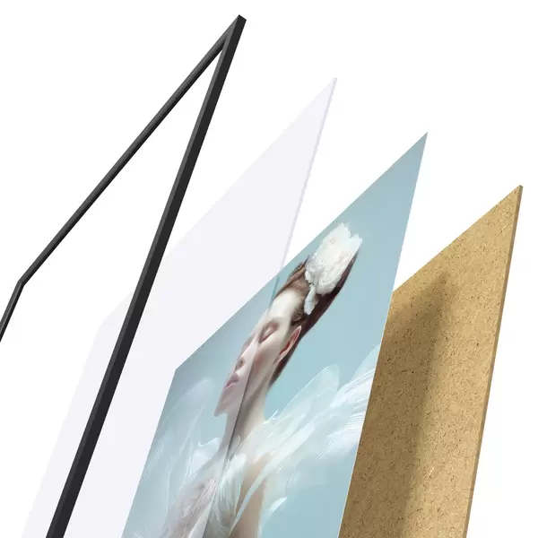 Plagát sa skladá z rámu, plexiskla, vytlačeného obrazu a podkladu z drevotriesky. Plagát možno okamžite zavesiť na stenu vďaka úchytom na zadnej strane.