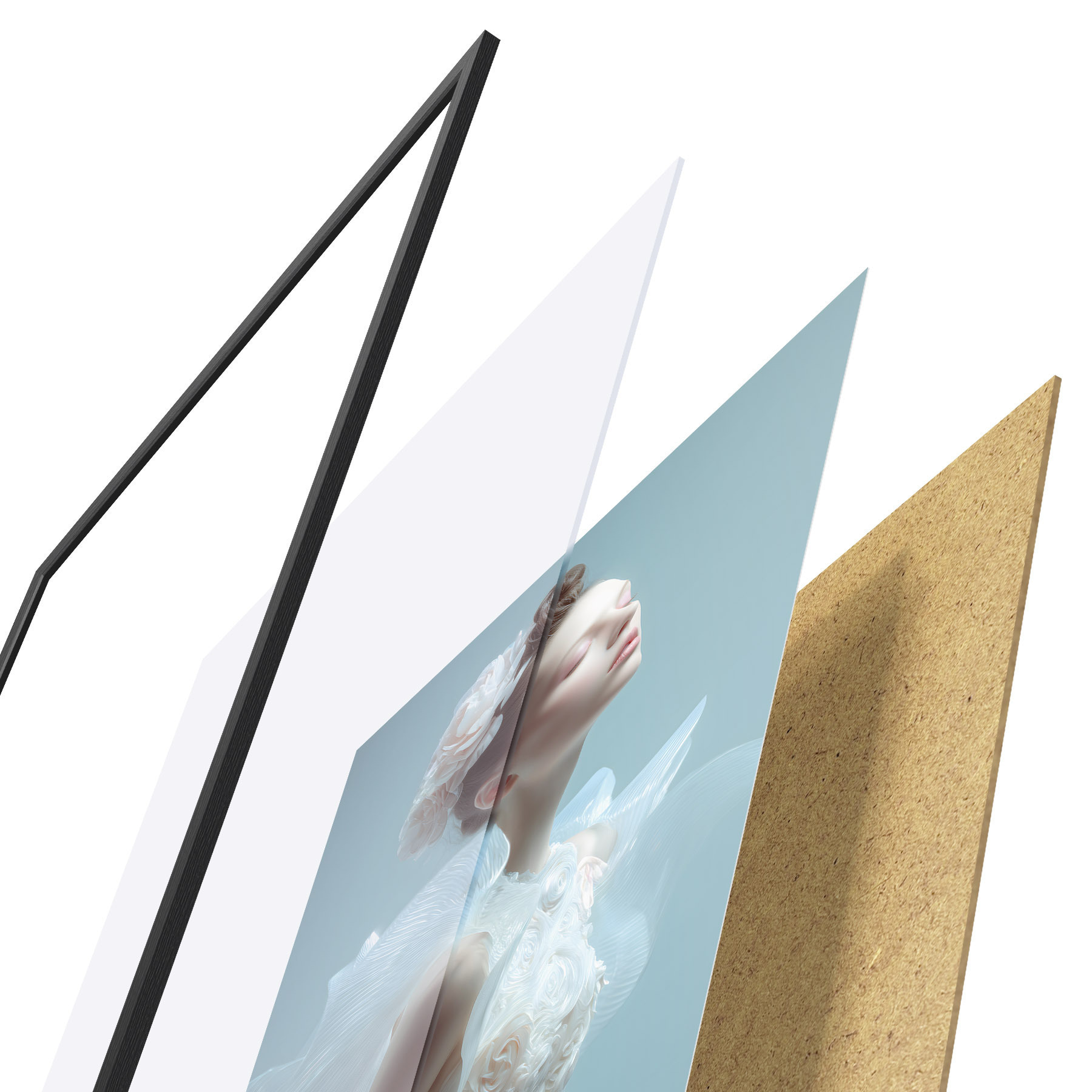 Plagát sa skladá z rámu, plexiskla, vytlačeného obrazu a podkladu z drevotriesky. Plagát možno okamžite zavesiť na stenu vďaka úchytom na zadnej strane.