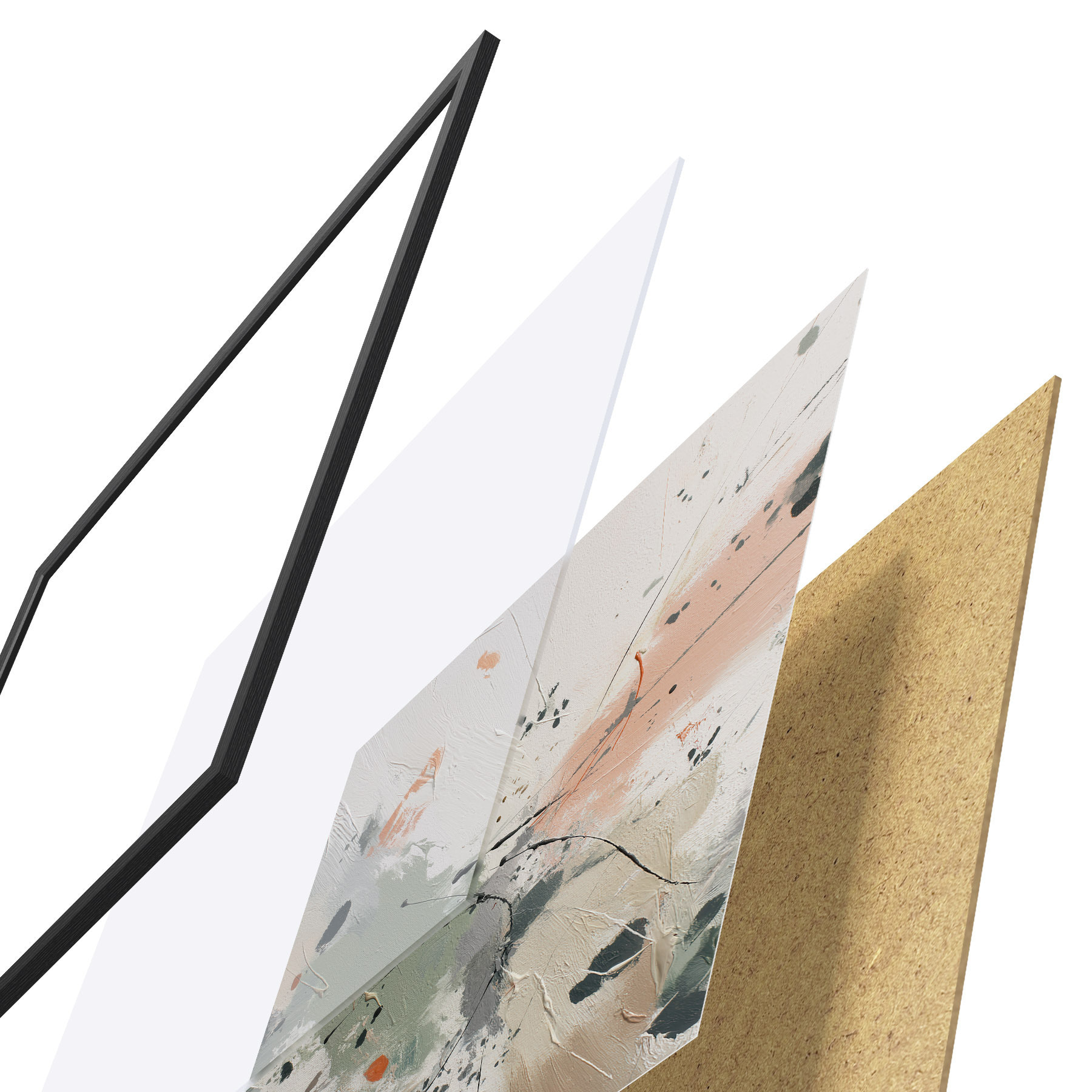 Plagát sa skladá z rámu, plexiskla, vytlačeného obrazu a podkladu z drevotriesky. Plagát možno okamžite zavesiť na stenu vďaka úchytom na zadnej strane.