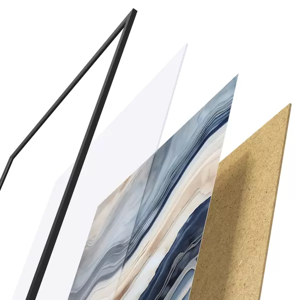 Plagát sa skladá z rámu, plexiskla, vytlačeného obrazu a podkladu z drevotriesky. Plagát možno okamžite zavesiť na stenu vďaka úchytom na zadnej strane.
