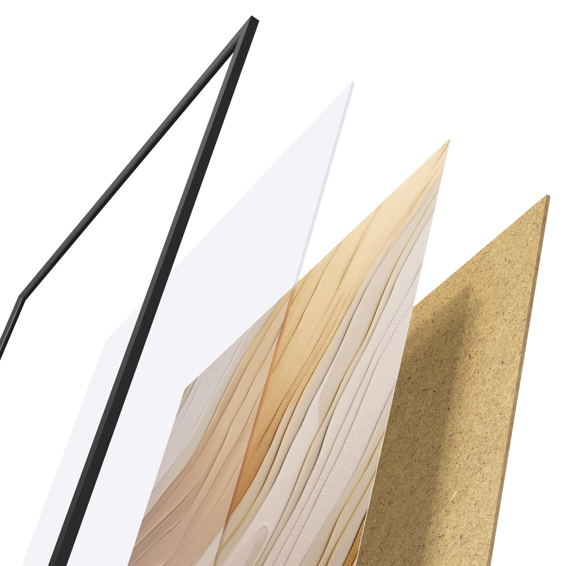 Plagát sa skladá z rámu, plexiskla, vytlačeného obrazu a podkladu z drevotriesky. Plagát možno okamžite zavesiť na stenu vďaka úchytom na zadnej strane.