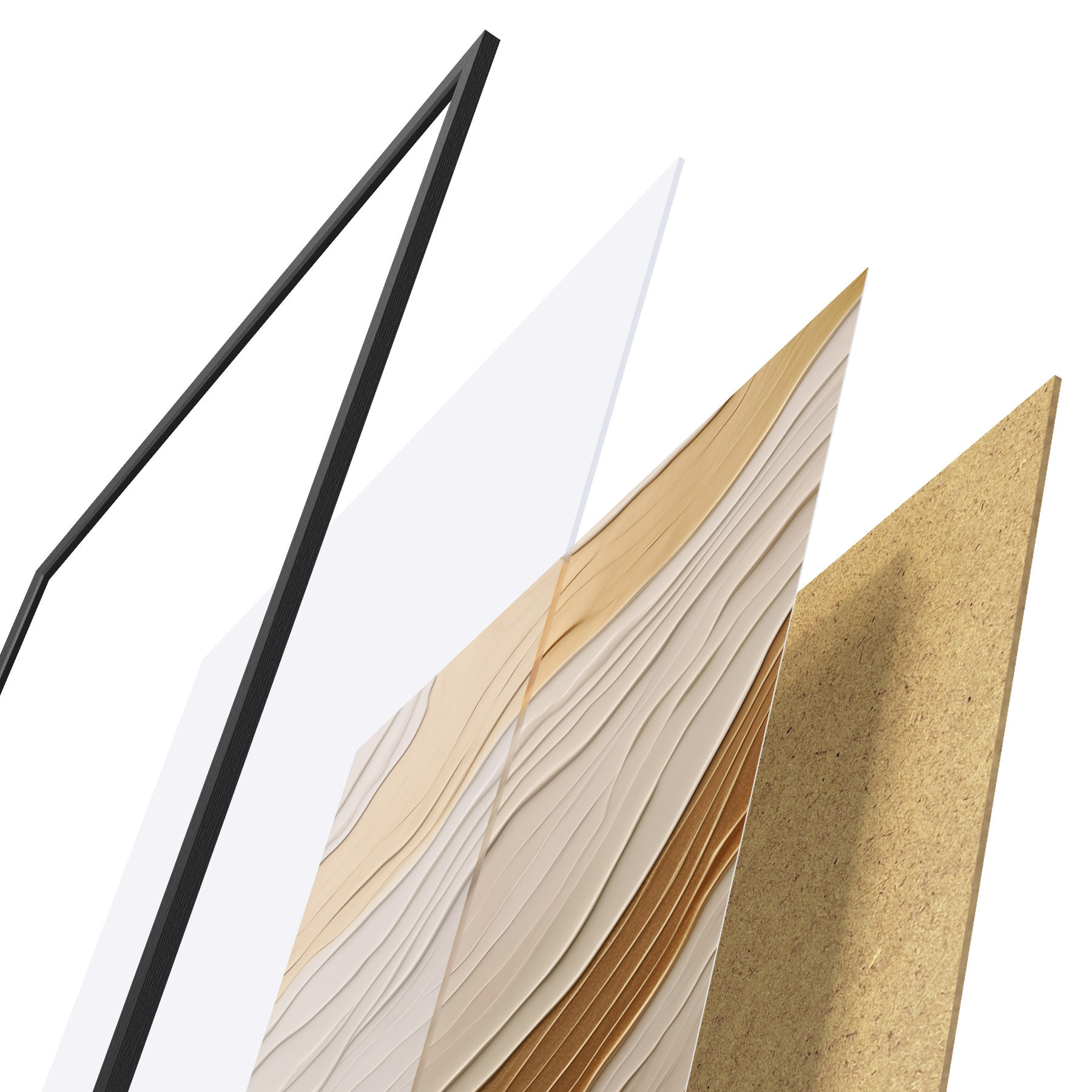 Plagát sa skladá z rámu, plexiskla, vytlačeného obrazu a podkladu z drevotriesky. Plagát možno okamžite zavesiť na stenu vďaka úchytom na zadnej strane.