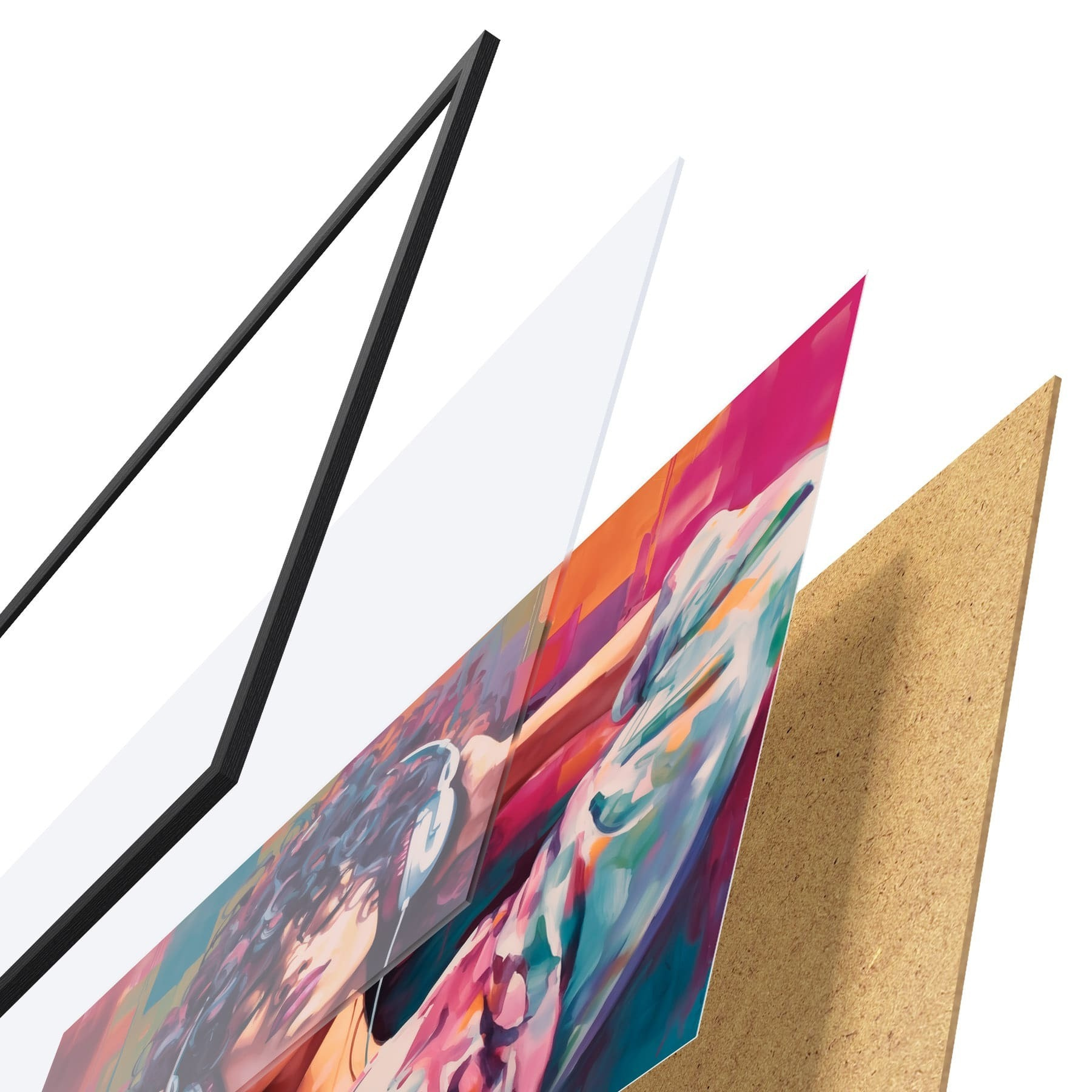 Plagát sa skladá z rámu, plexiskla, vytlačeného obrazu a podkladu z drevotriesky. Plagát možno okamžite zavesiť na stenu vďaka úchytom na zadnej strane.