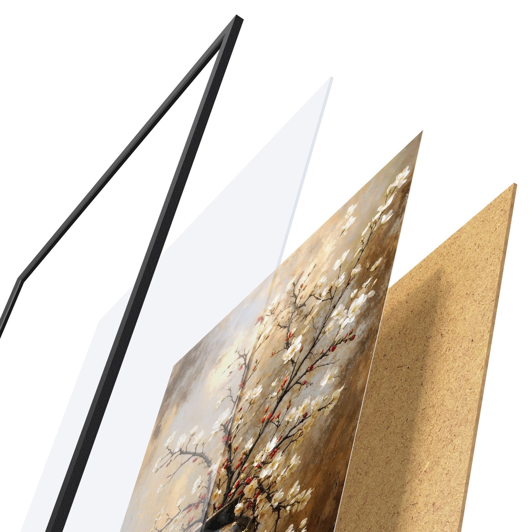 Plagát sa skladá z rámu, plexiskla, vytlačeného obrazu a podkladu z drevotriesky. Plagát možno okamžite zavesiť na stenu vďaka úchytom na zadnej strane.