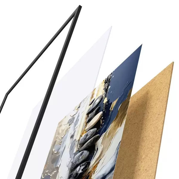 Plagát sa skladá z rámu, plexiskla, vytlačeného obrazu a podkladu z drevotriesky. Plagát možno okamžite zavesiť na stenu vďaka úchytom na zadnej strane.