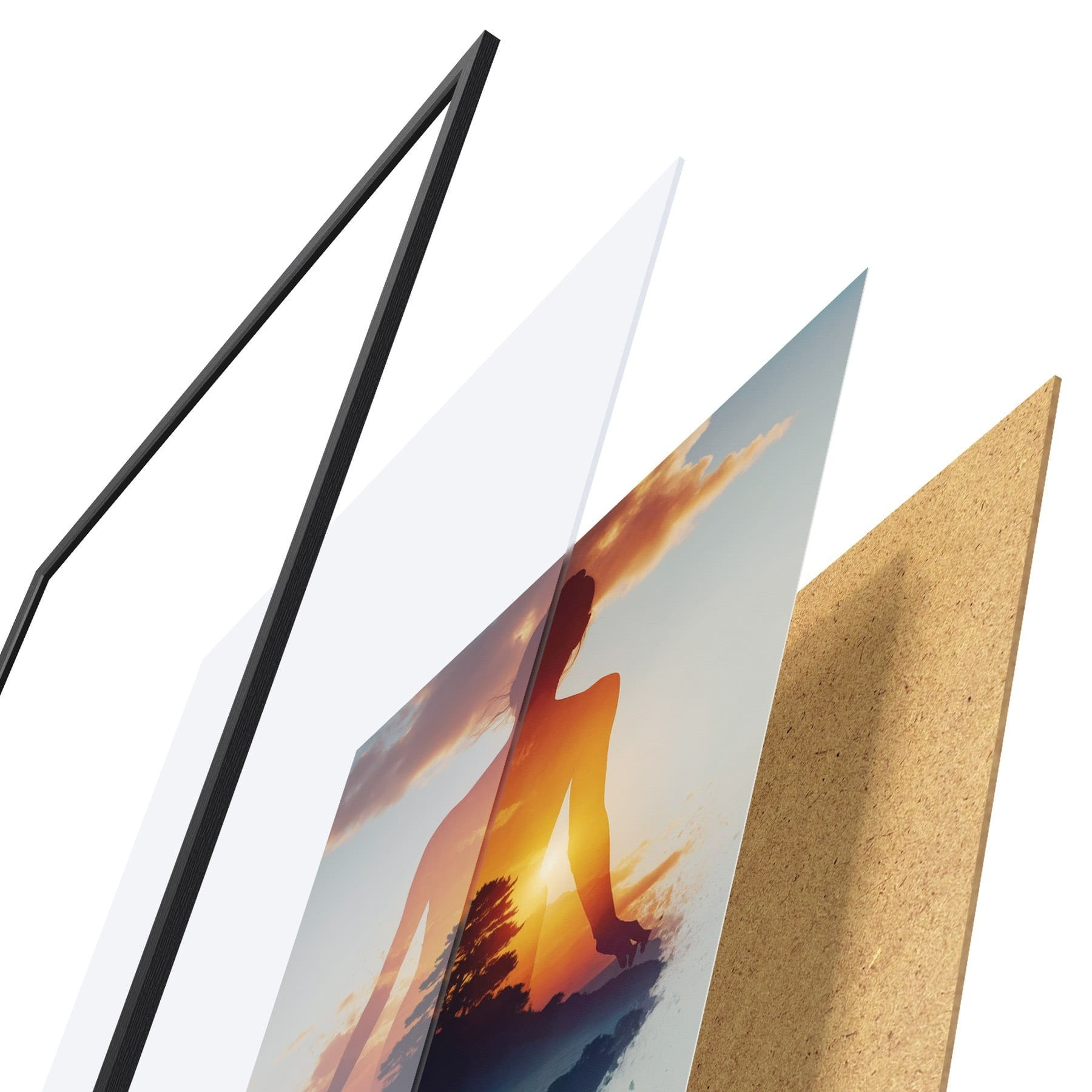Plagát sa skladá z rámu, plexiskla, vytlačeného obrazu a podkladu z drevotriesky. Plagát možno okamžite zavesiť na stenu vďaka úchytom na zadnej strane.