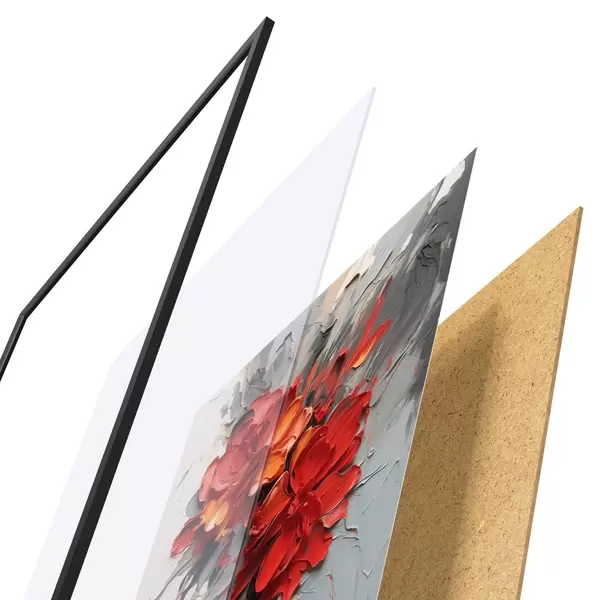 Plagát sa skladá z rámu, plexiskla, vytlačeného obrazu a podkladu z drevotriesky. Plagát možno okamžite zavesiť na stenu vďaka úchytom na zadnej strane.