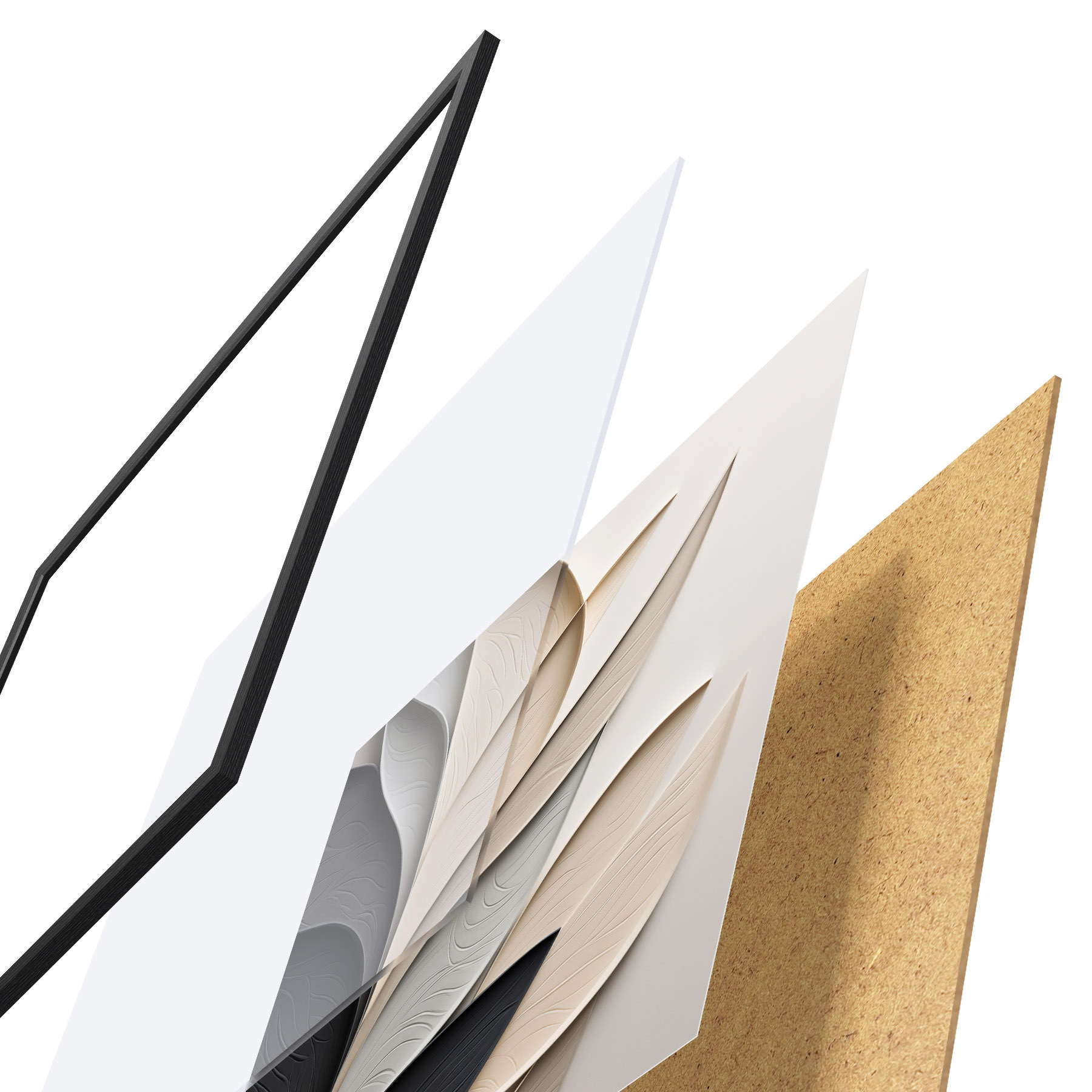 Plagát sa skladá z rámu, plexiskla, vytlačeného obrazu a podkladu z drevotriesky. Plagát možno okamžite zavesiť na stenu vďaka úchytom na zadnej strane.