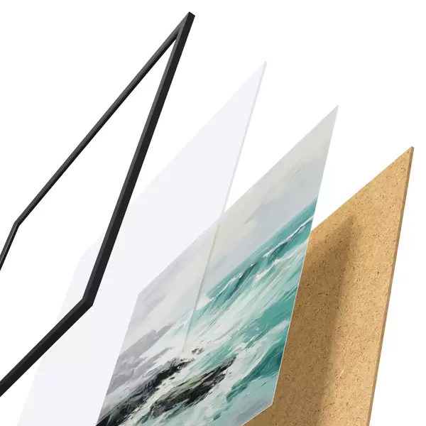 Plagát sa skladá z rámu, plexiskla, vytlačeného obrazu a podkladu z drevotriesky. Plagát možno okamžite zavesiť na stenu vďaka úchytom na zadnej strane.