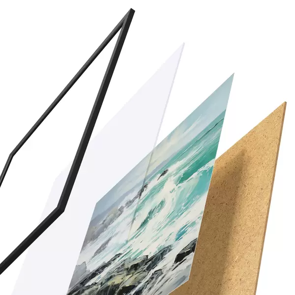 Plagát sa skladá z rámu, plexiskla, vytlačeného obrazu a podkladu z drevotriesky. Plagát možno okamžite zavesiť na stenu vďaka úchytom na zadnej strane.