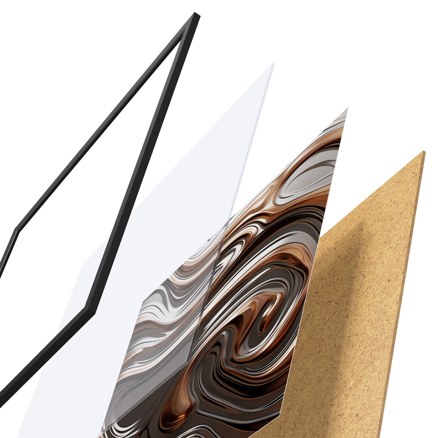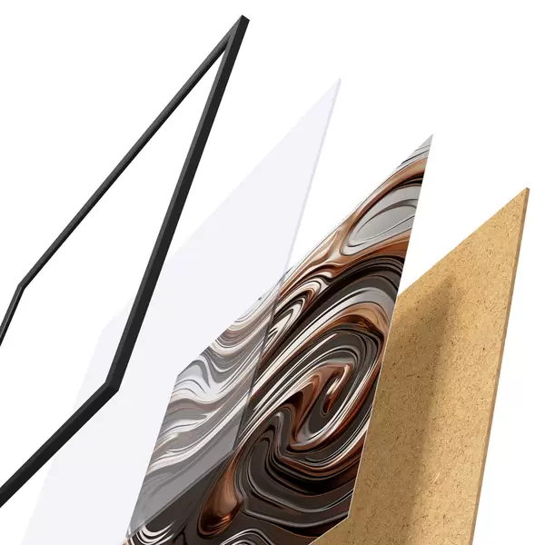 Plagát sa skladá z rámu, plexiskla, vytlačeného obrazu a podkladu z drevotriesky. Plagát možno okamžite zavesiť na stenu vďaka úchytom na zadnej strane.