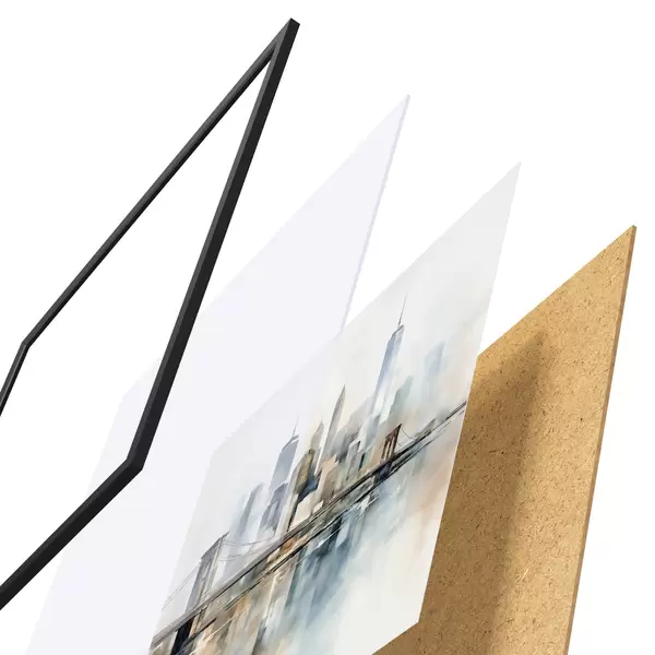 Plagát sa skladá z rámu, plexiskla, vytlačeného obrazu a podkladu z drevotriesky. Plagát možno okamžite zavesiť na stenu vďaka úchytom na zadnej strane.