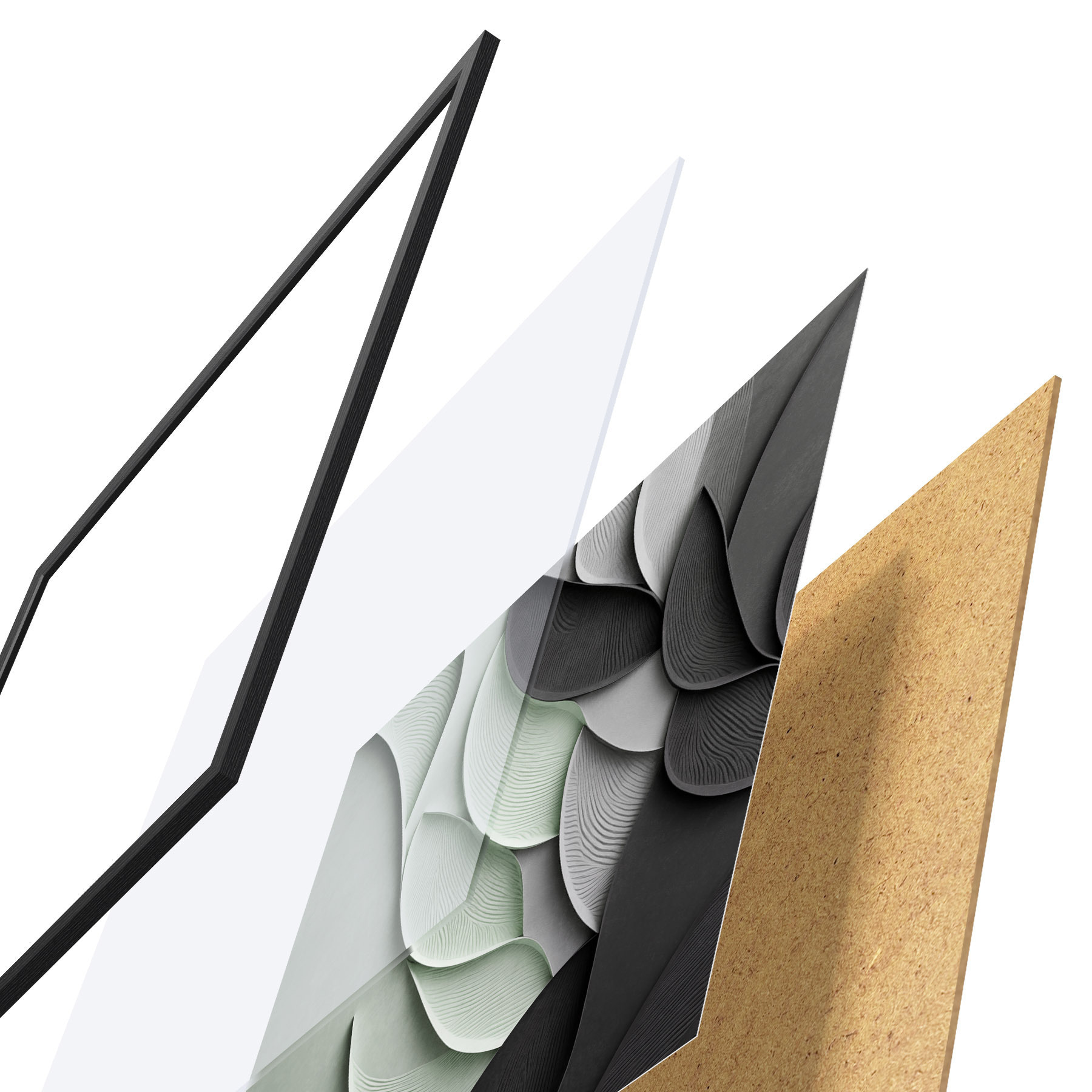 Plagát sa skladá z rámu, plexiskla, vytlačeného obrazu a podkladu z drevotriesky. Plagát možno okamžite zavesiť na stenu vďaka úchytom na zadnej strane.