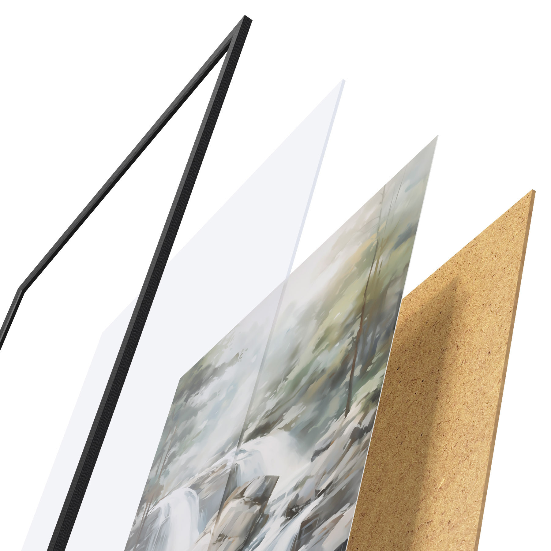 Plagát sa skladá z rámu, plexiskla, vytlačeného obrazu a podkladu z drevotriesky. Plagát možno okamžite zavesiť na stenu vďaka úchytom na zadnej strane.