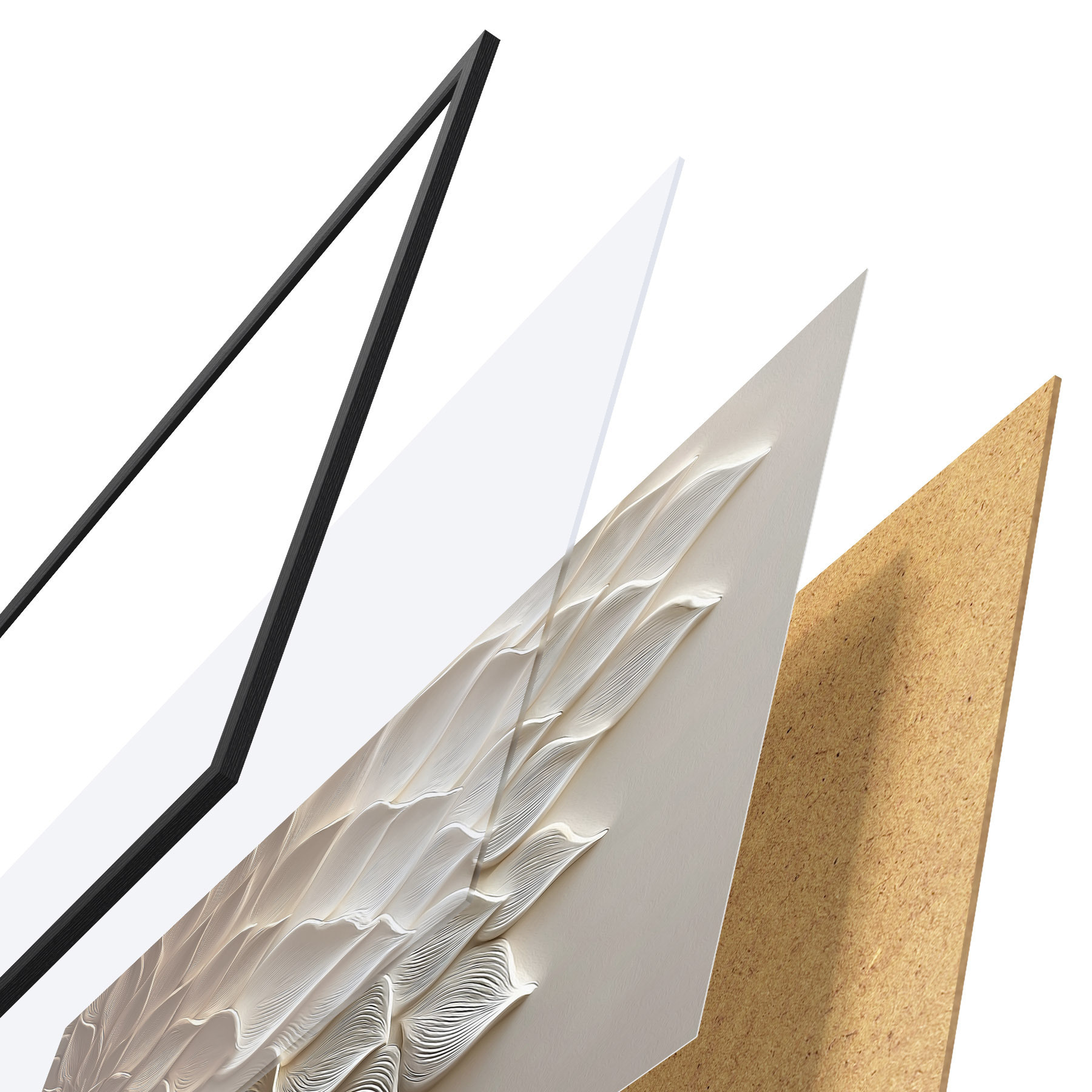 Plagát sa skladá z rámu, plexiskla, vytlačeného obrazu a podkladu z drevotriesky. Plagát možno okamžite zavesiť na stenu vďaka úchytom na zadnej strane.