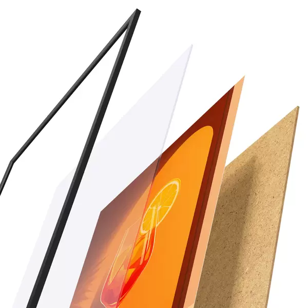 Plagát sa skladá z rámu, plexiskla, vytlačeného obrazu a podkladu z drevotriesky. Plagát možno okamžite zavesiť na stenu vďaka úchytom na zadnej strane.