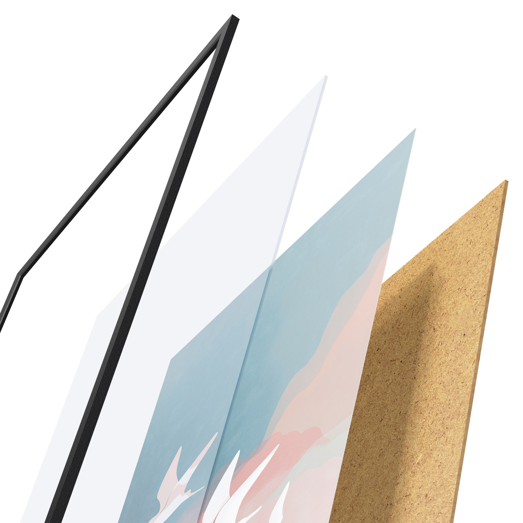 Plagát sa skladá z rámu, plexiskla, vytlačeného obrazu a podkladu z drevotriesky. Plagát možno okamžite zavesiť na stenu vďaka úchytom na zadnej strane.