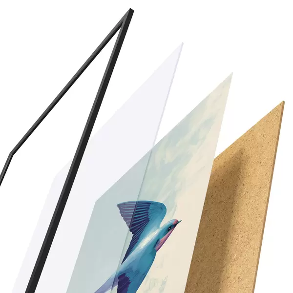 Plagát sa skladá z rámu, plexiskla, vytlačeného obrazu a podkladu z drevotriesky. Plagát možno okamžite zavesiť na stenu vďaka úchytom na zadnej strane.