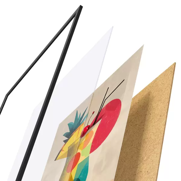 Plagát sa skladá z rámu, plexiskla, vytlačeného obrazu a podkladu z drevotriesky. Plagát možno okamžite zavesiť na stenu vďaka úchytom na zadnej strane.