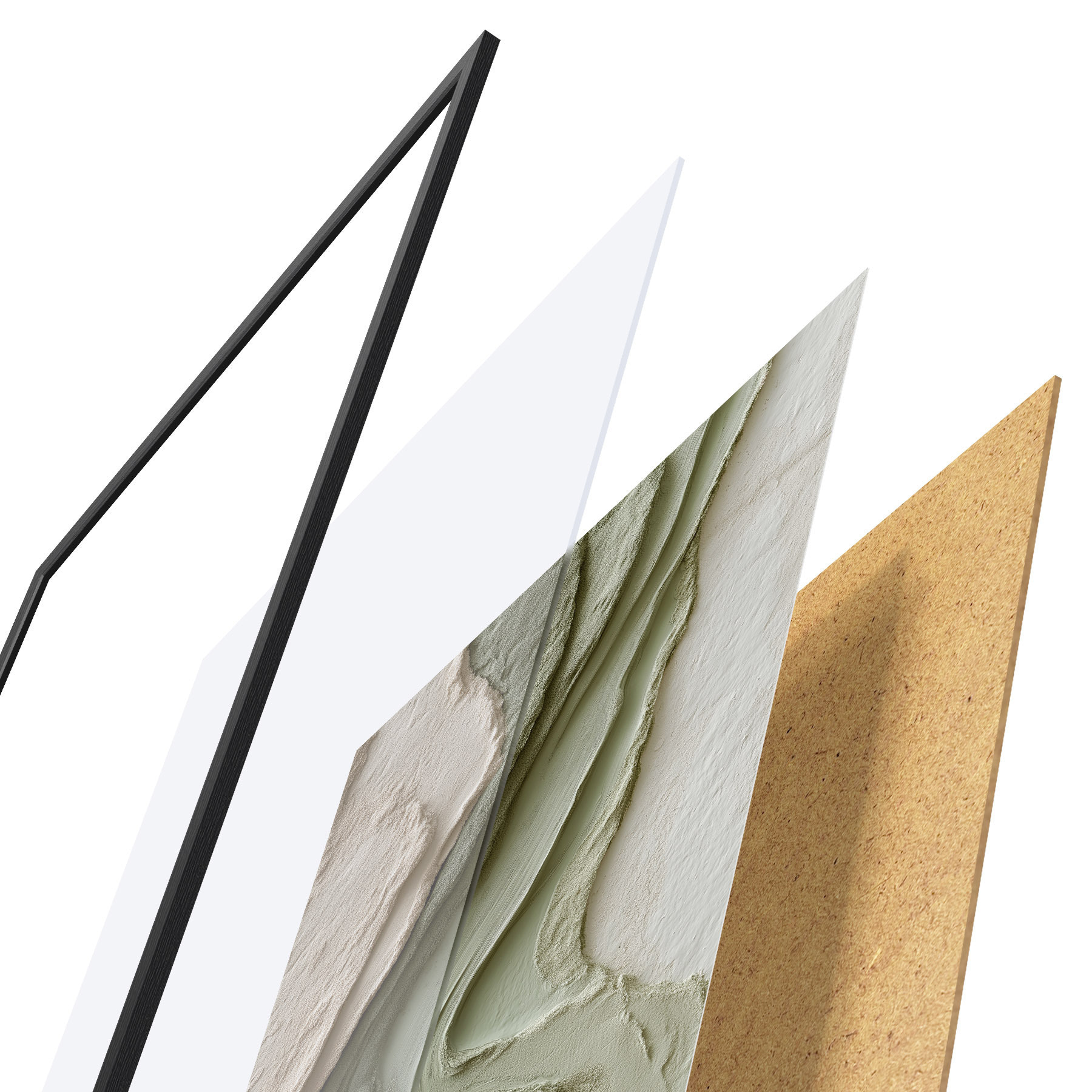 Plagát sa skladá z rámu, plexiskla, vytlačeného obrazu a podkladu z drevotriesky. Plagát možno okamžite zavesiť na stenu vďaka úchytom na zadnej strane.