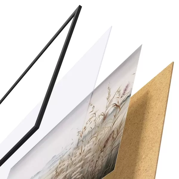 Plagát sa skladá z rámu, plexiskla, vytlačeného obrazu a podkladu z drevotriesky. Plagát možno okamžite zavesiť na stenu vďaka úchytom na zadnej strane.