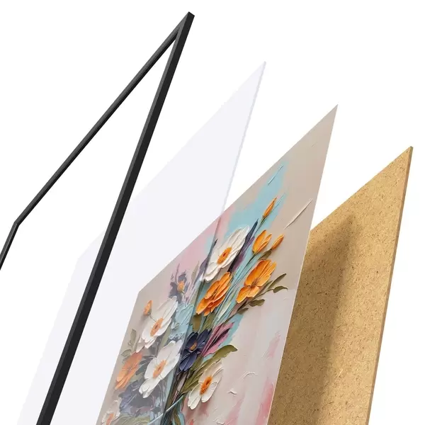 Plagát sa skladá z rámu, plexiskla, vytlačeného obrazu a podkladu z drevotriesky. Plagát možno okamžite zavesiť na stenu vďaka úchytom na zadnej strane.