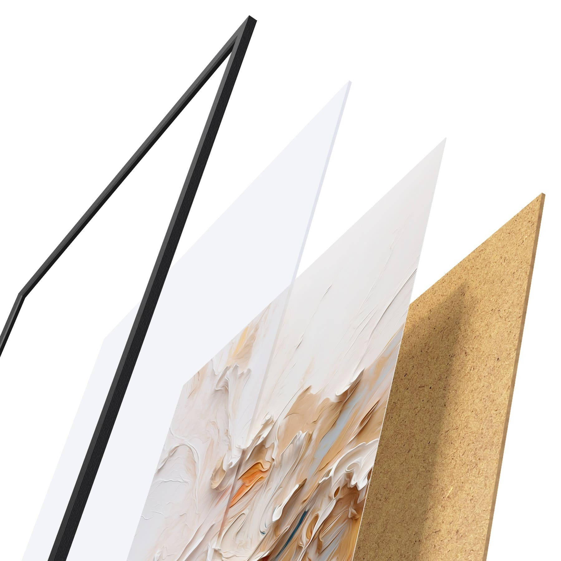 Plagát sa skladá z rámu, plexiskla, vytlačeného obrazu a podkladu z drevotriesky. Plagát možno okamžite zavesiť na stenu vďaka úchytom na zadnej strane.