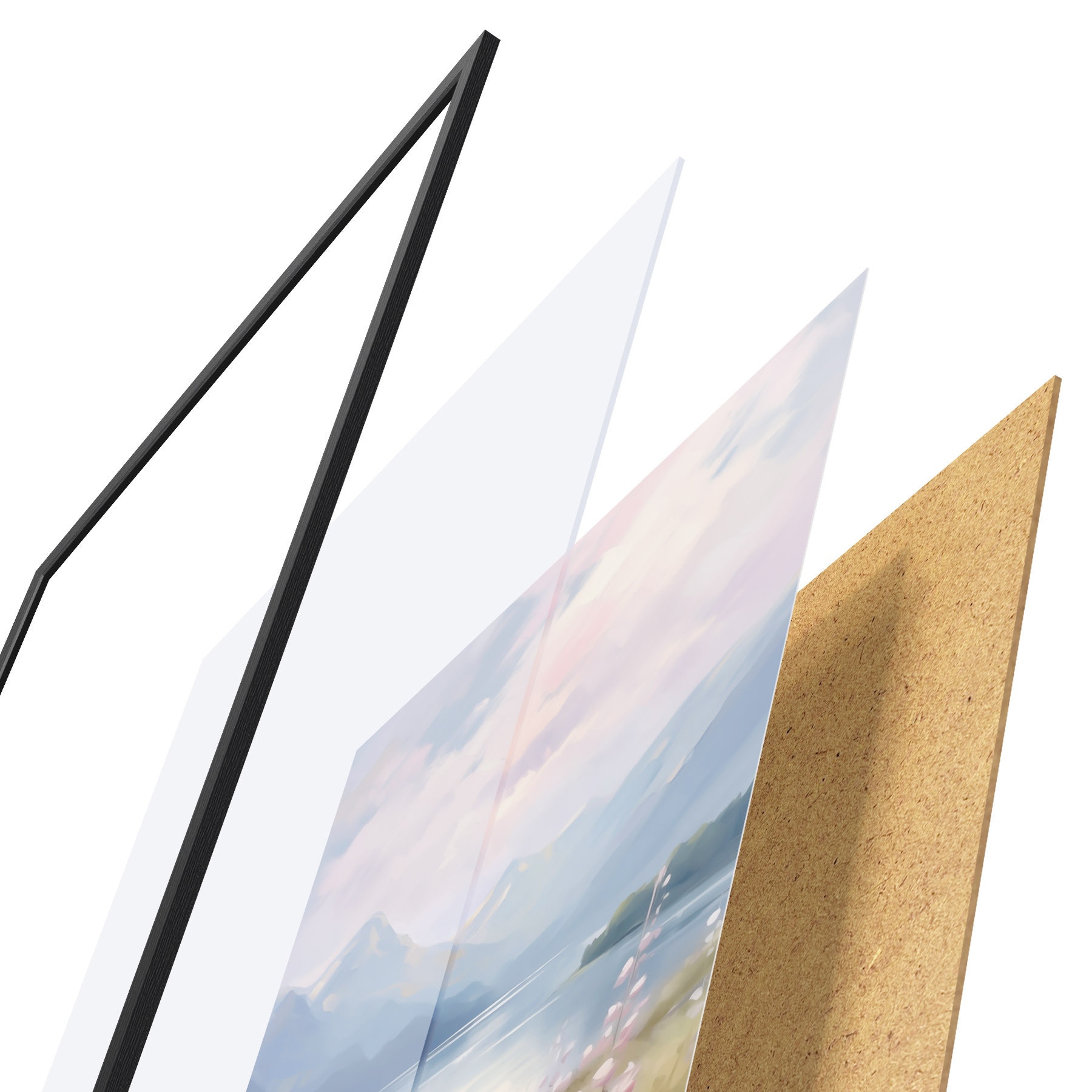 Plagát sa skladá z rámu, plexiskla, vytlačeného obrazu a podkladu z drevotriesky. Plagát možno okamžite zavesiť na stenu vďaka úchytom na zadnej strane.