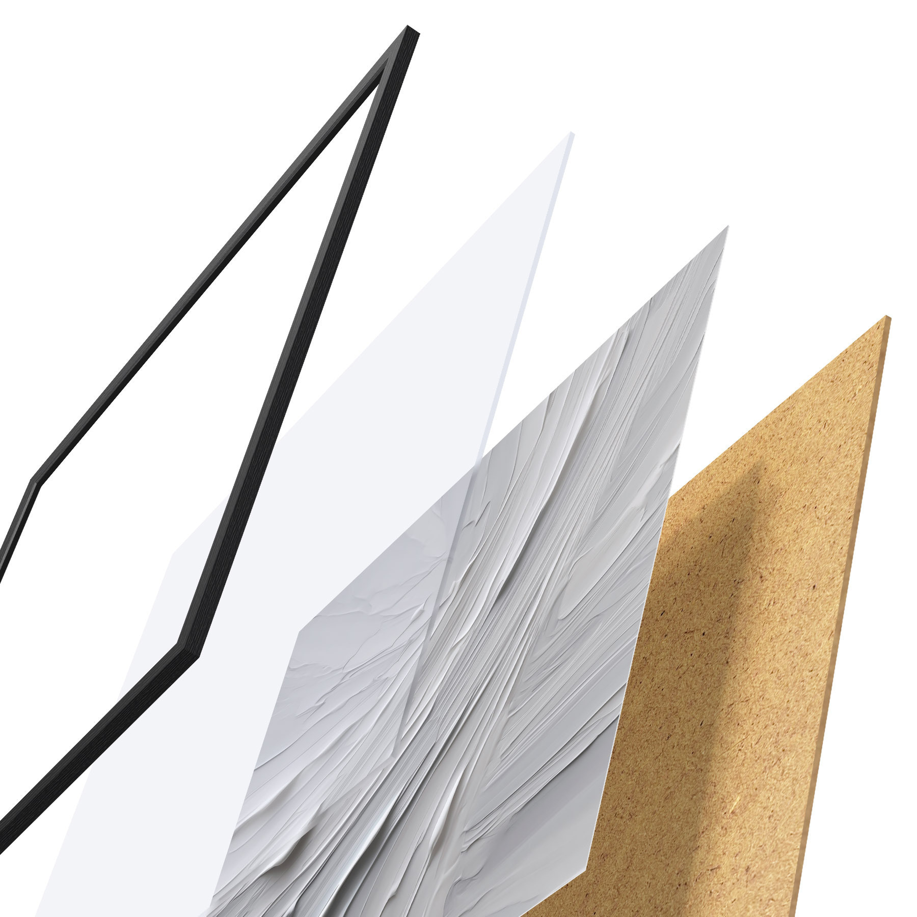 Plagát sa skladá z rámu, plexiskla, vytlačeného obrazu a podkladu z drevotriesky. Plagát možno okamžite zavesiť na stenu vďaka úchytom na zadnej strane.