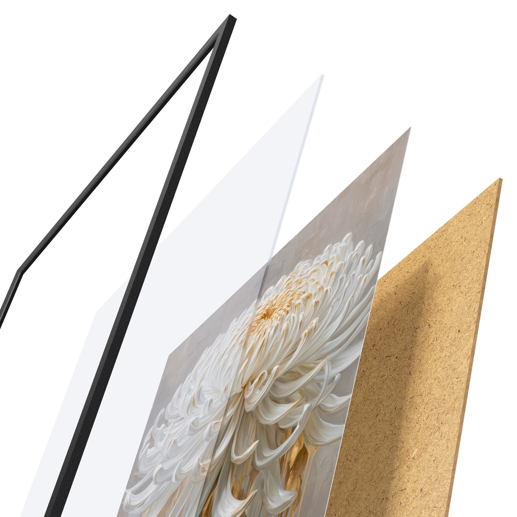 Plagát sa skladá z rámu, plexiskla, vytlačeného obrazu a podkladu z drevotriesky. Plagát možno okamžite zavesiť na stenu vďaka úchytom na zadnej strane.
