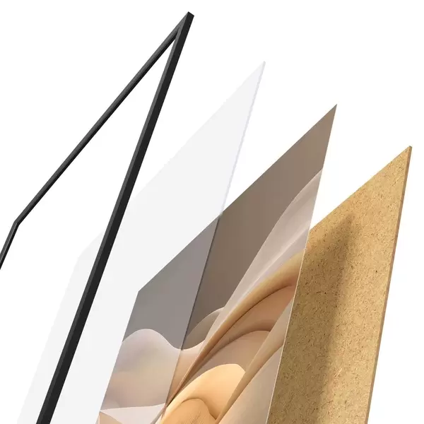 Plagát sa skladá z rámu, plexiskla, vytlačeného obrazu a podkladu z drevotriesky. Plagát možno okamžite zavesiť na stenu vďaka úchytom na zadnej strane.