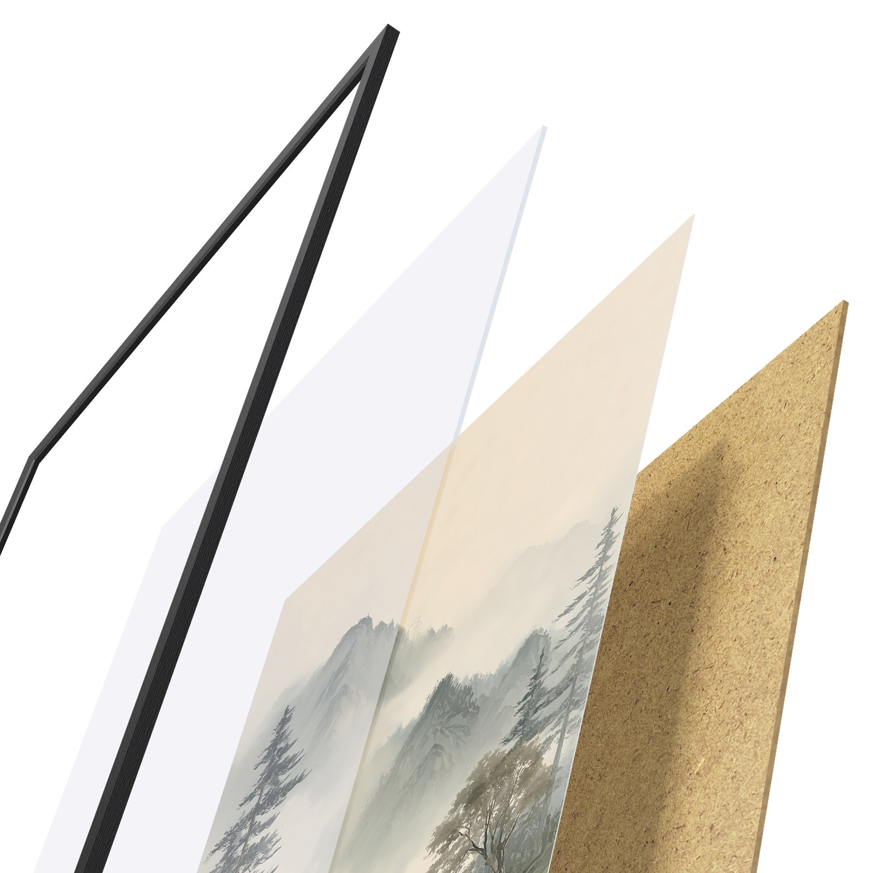 Plagát sa skladá z rámu, plexiskla, vytlačeného obrazu a podkladu z drevotriesky. Plagát možno okamžite zavesiť na stenu vďaka úchytom na zadnej strane.