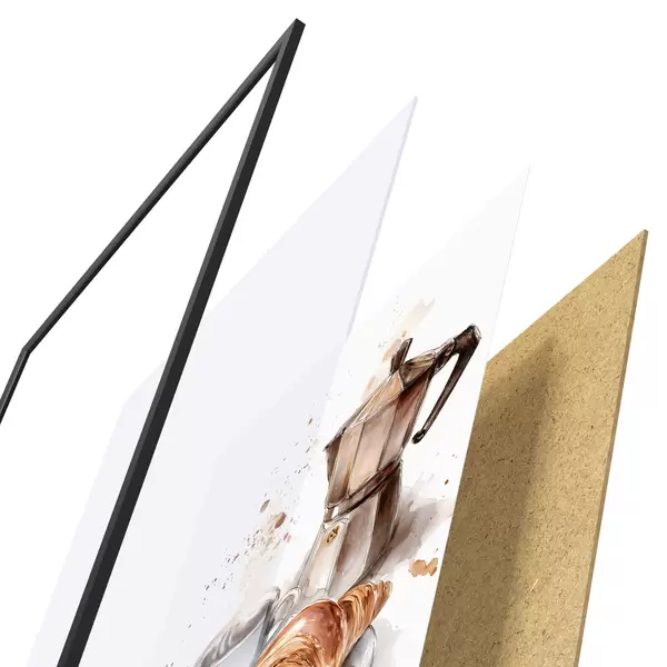 Plagát sa skladá z rámu, plexiskla, vytlačeného obrazu a podkladu z drevotriesky. Plagát možno okamžite zavesiť na stenu vďaka úchytom na zadnej strane.