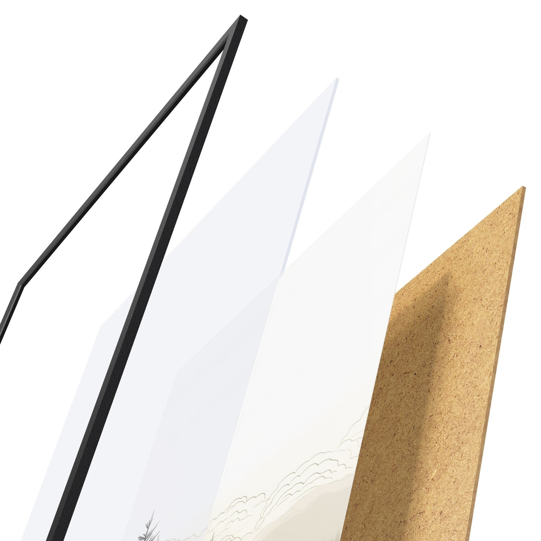 Plagát sa skladá z rámu, plexiskla, vytlačeného obrazu a podkladu z drevotriesky. Plagát možno okamžite zavesiť na stenu vďaka úchytom na zadnej strane.