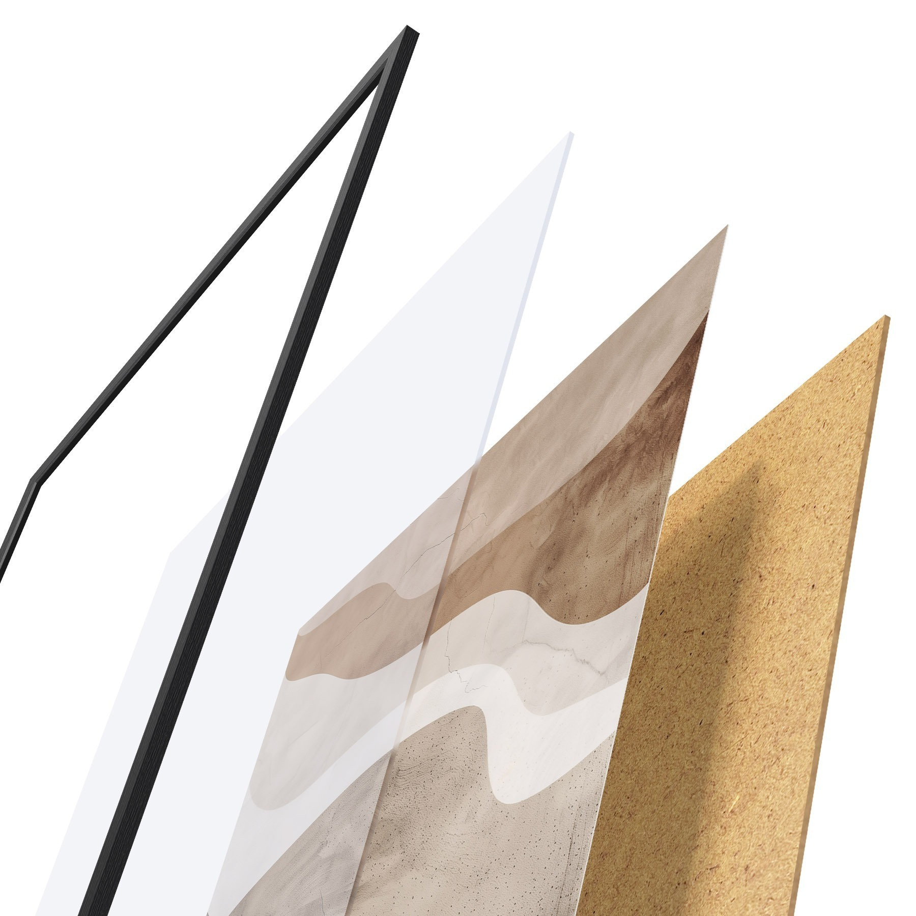 Plagát sa skladá z rámu, plexiskla, vytlačeného obrazu a podkladu z drevotriesky. Plagát možno okamžite zavesiť na stenu vďaka úchytom na zadnej strane.
