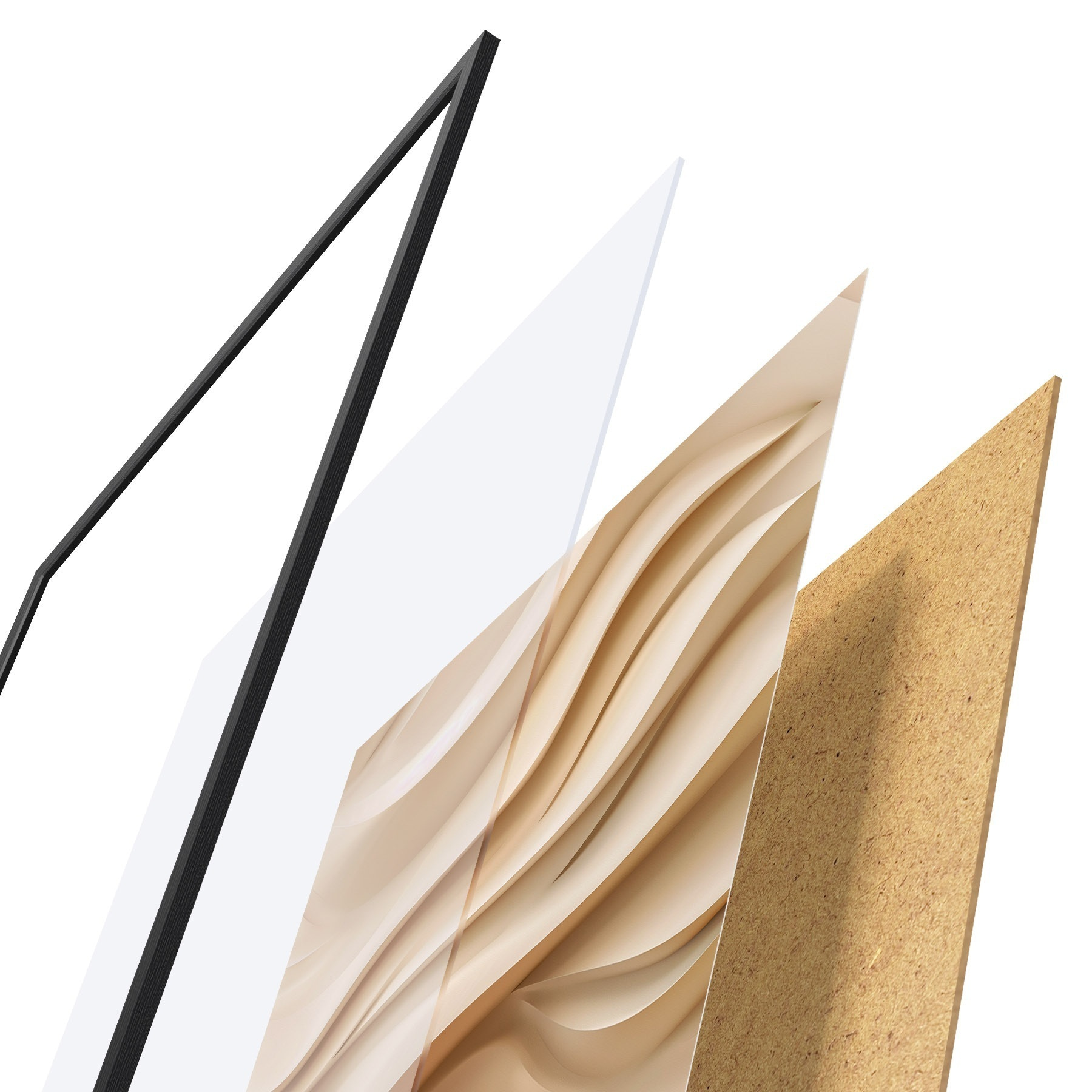 Plagát sa skladá z rámu, plexiskla, vytlačeného obrazu a podkladu z drevotriesky. Plagát možno okamžite zavesiť na stenu vďaka úchytom na zadnej strane.