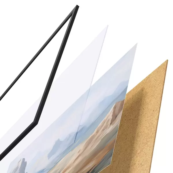 Plagát sa skladá z rámu, plexiskla, vytlačeného obrazu a podkladu z drevotriesky. Plagát možno okamžite zavesiť na stenu vďaka úchytom na zadnej strane.
