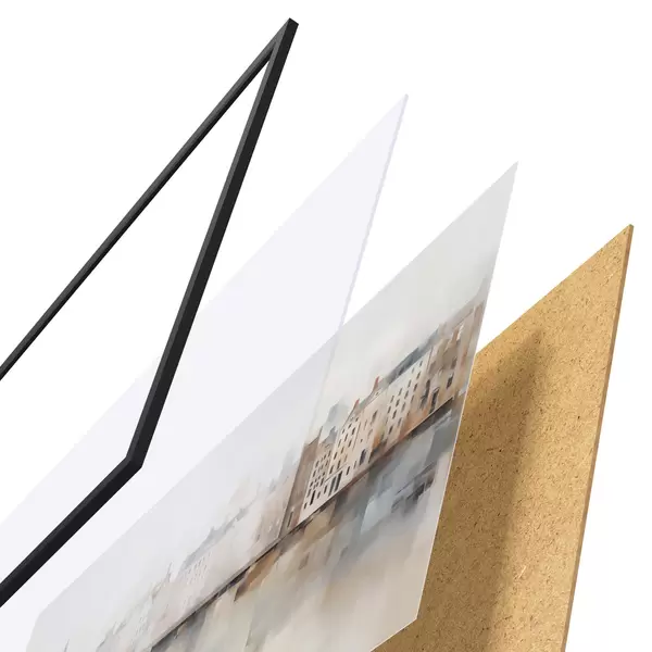 Plagát sa skladá z rámu, plexiskla, vytlačeného obrazu a podkladu z drevotriesky. Plagát možno okamžite zavesiť na stenu vďaka úchytom na zadnej strane.