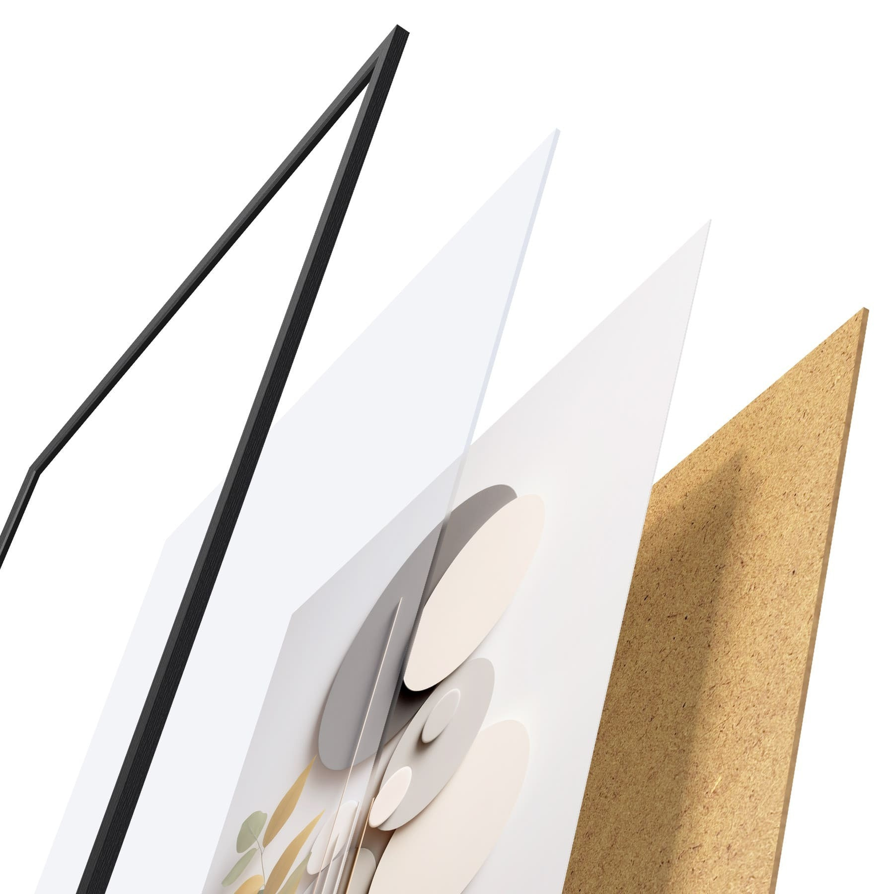 Plagát sa skladá z rámu, plexiskla, vytlačeného obrazu a podkladu z drevotriesky. Plagát možno okamžite zavesiť na stenu vďaka úchytom na zadnej strane.