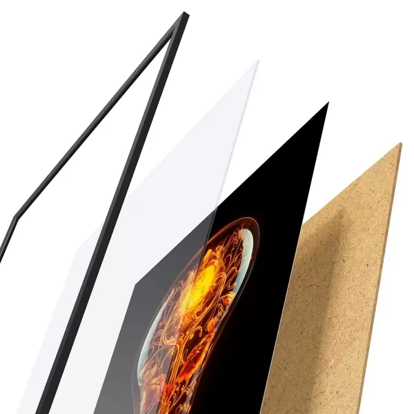 Plagát sa skladá z rámu, plexiskla, vytlačeného obrazu a podkladu z drevotriesky. Plagát možno okamžite zavesiť na stenu vďaka úchytom na zadnej strane.