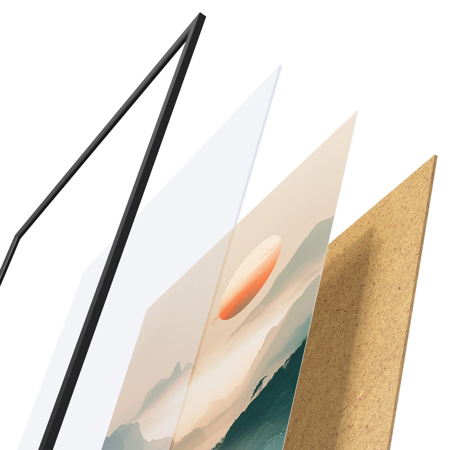 Plagát sa skladá z rámu, plexiskla, vytlačeného obrazu a podkladu z drevotriesky. Plagát možno okamžite zavesiť na stenu vďaka úchytom na zadnej strane.